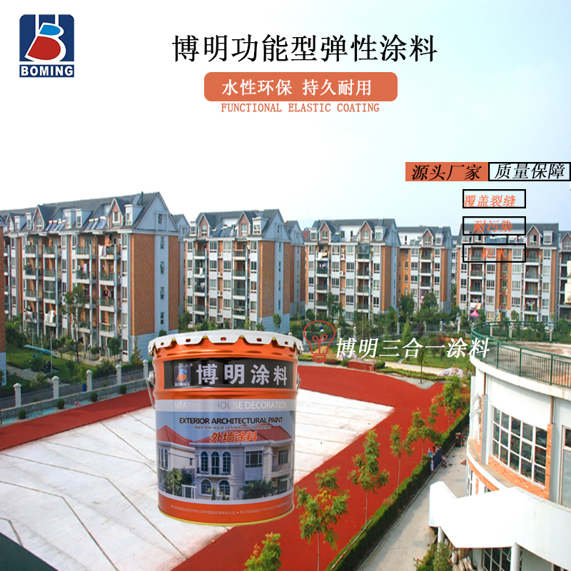 博明三合一弹性涂料是以特殊改性高弹性合成树脂和特殊丙烯酸硅合成树脂组成主要粘合剂的三合一弹性涂料,是一种伸长性和抗张强度良好平衡的常规性弹性涂料,特具弹性、防水、耐污染三大功能。